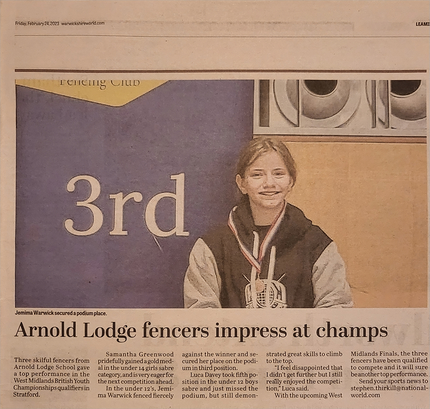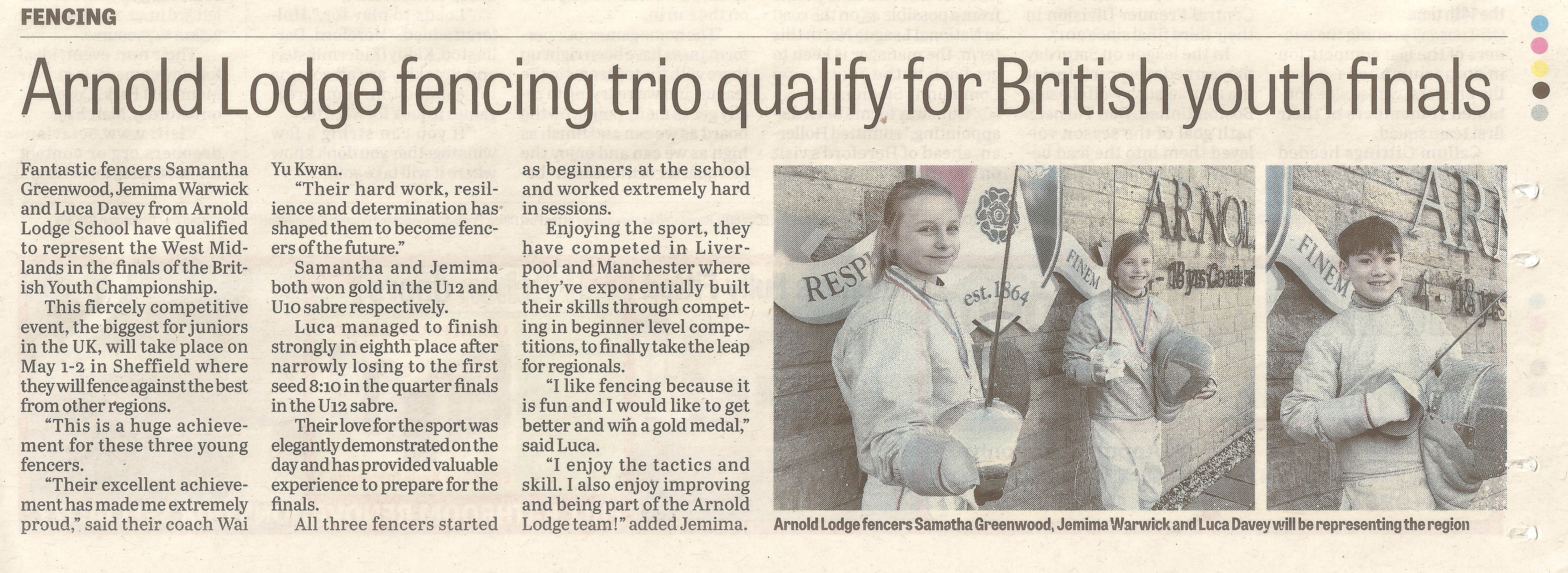 Fantastic fencers Samantha Greenwood, Jemima Warwick and Luca Davey from Arnold Lodge School have qualified to represent the West Midlands in the finals of the British Youth Championship.